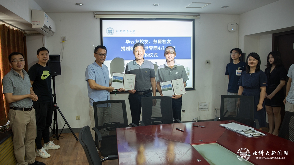 王鹂代表学校与彭原、毕云龙共同签订了版权捐赠协议,薛庆国向两位校友颁发捐赠证书。